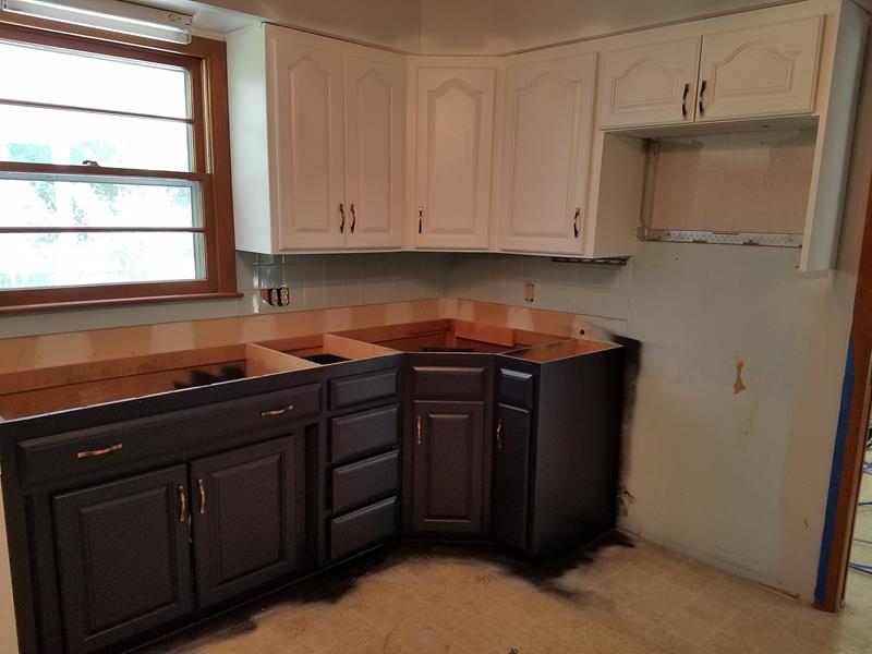 This was a complete remodel project. The customer wanted the cabinets painted before they put the new counter tops on so they could base some other decisions off of the look of the cabinets.